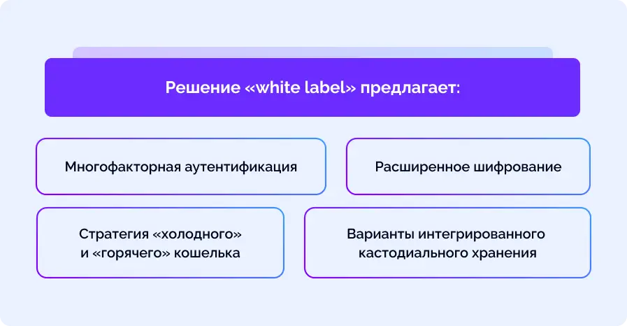 Ответ: Да. Наше решение включает многоуровневое шифрование, модель безопасности «холодный» и «горячий» кошельки, а также гибкие возможности кастодиана, что позволяет вам выбрать собственное решение для хранения или подключиться к квалифицированным поставщикам.
